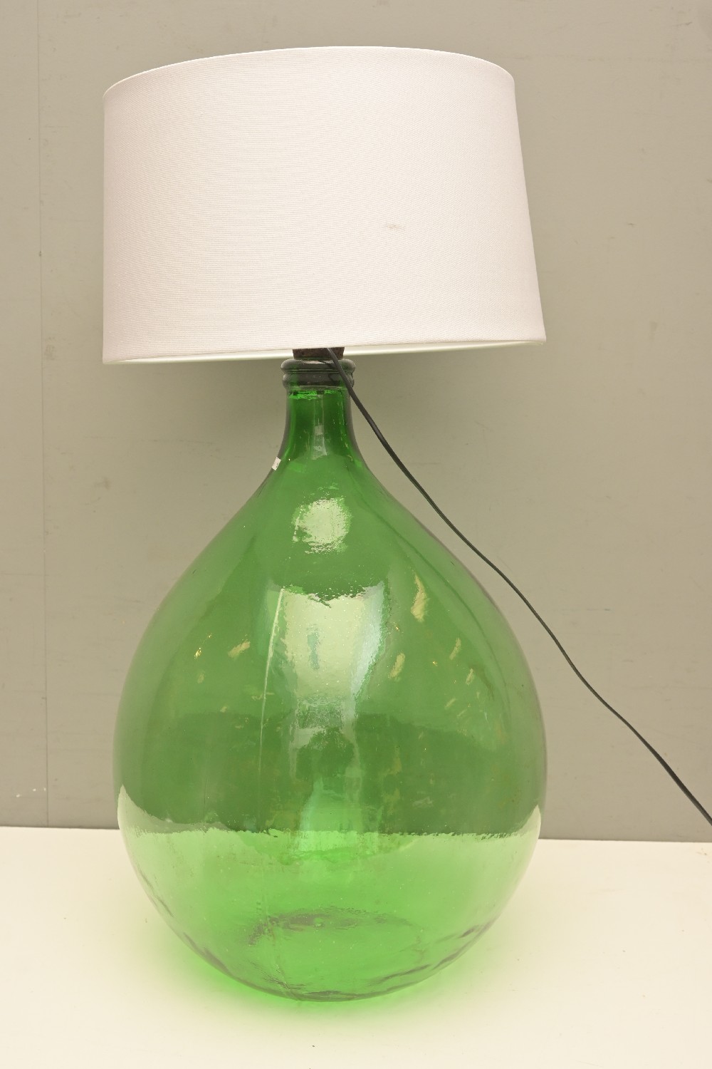 A LARGE GREEN DEMIJOHN BOTTLE CONVERTED TO TABLE LAMP (90H X 43DIAM CM) (LEONARD JOEL DELIVERY SIZE: LARGE)