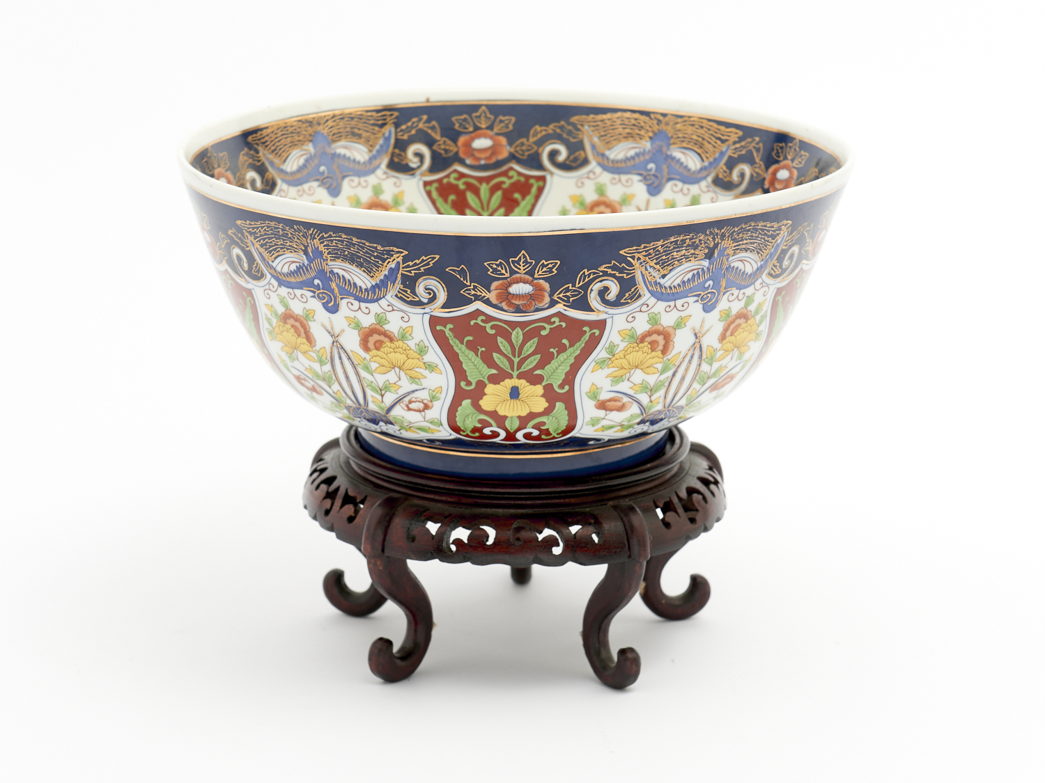 A LARGE IMARI STYLE BOWL ON WOODEN STAND DIA.30CM, LEONARD JOEL DELIVERY SIZE: LARGE