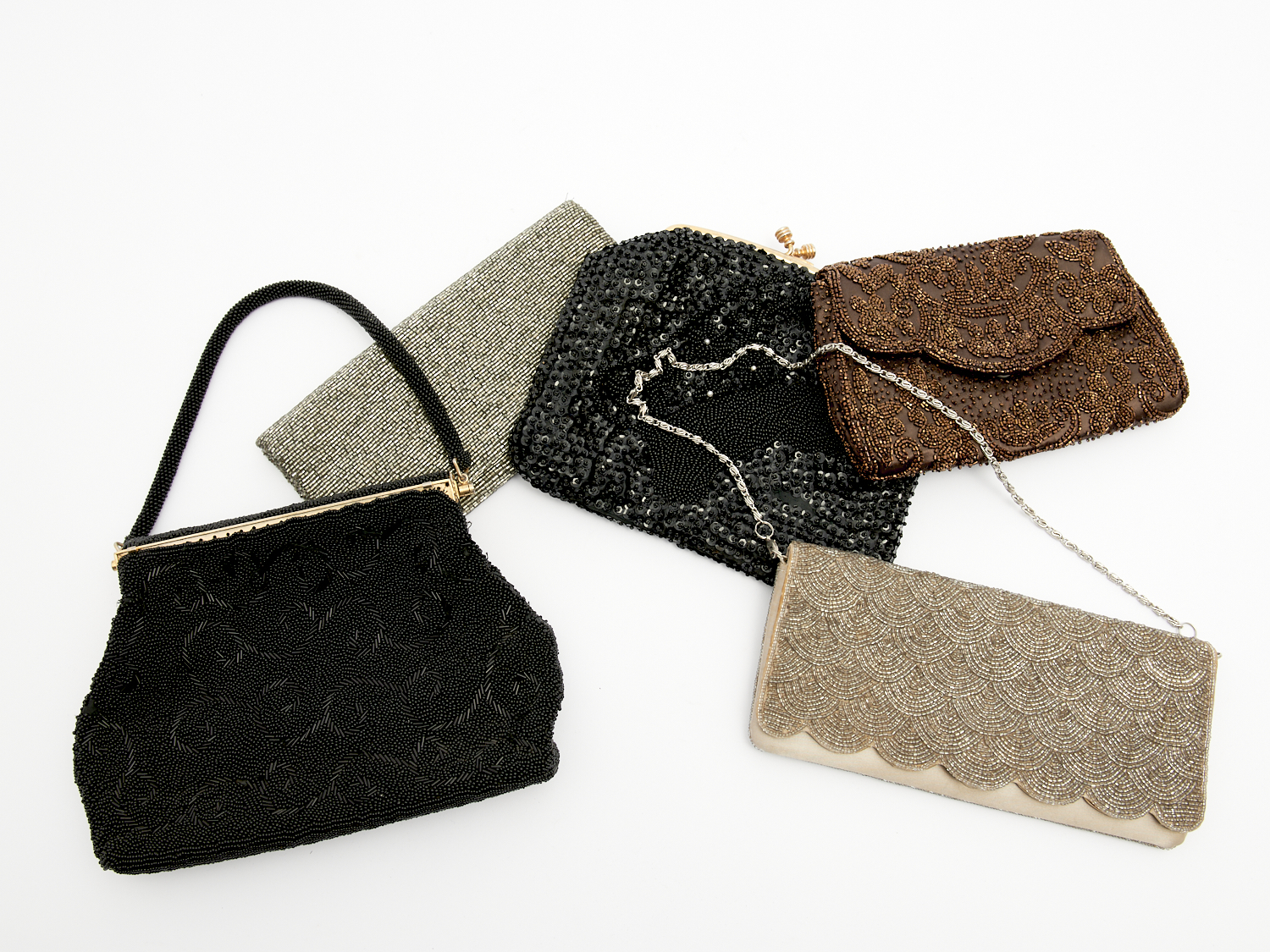 A COLLECTION OF FIVE SEQUINED AND BEADED EVENING PURSES W.26CM (WIDEST), LEONARD JOEL DELIVERY SIZE: SMALL
