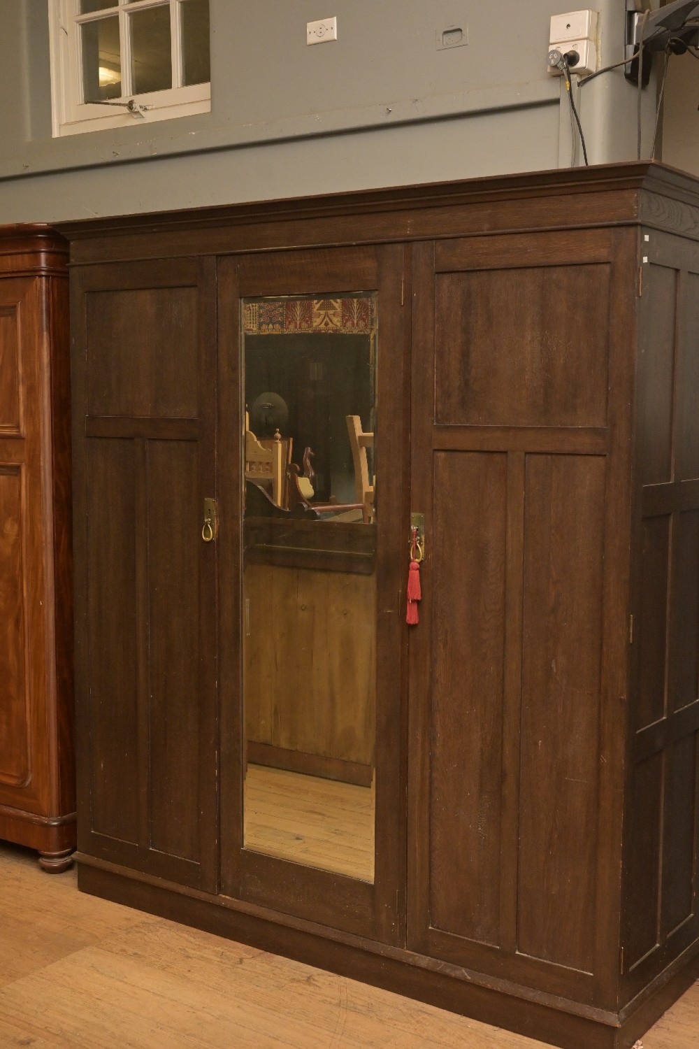 AN EARLY 20th CENTURY STAINED OAK WARDROBE, WITH FITTED INTERIOR – KEY IN OFFICE (A/F) (204H X 186W X 66D CM) (PLEASE NOTE THIS HEAVY ITEM MUST BE REMOVED BY CARRIERS AT THE CUSTOMER'S EXPENSE. LEONARD JOEL STAFF CANNOT ASSIST CARRYING THIS ITEM) (X-LARGE ITEM)