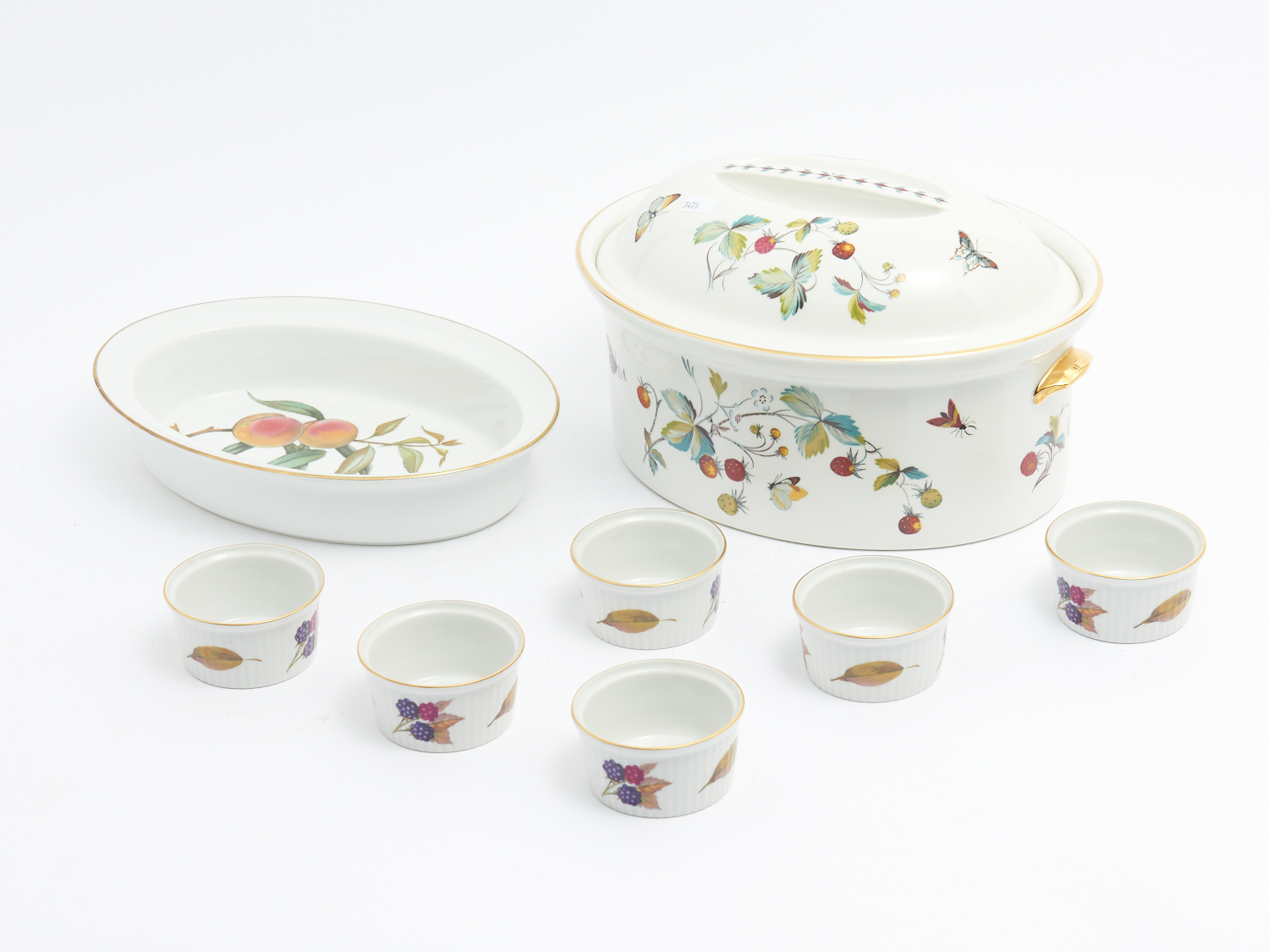 A GROUP OF ROYAL WORCESTER EVESHAM INCLUDING A LARGE LIDDED TUREEN, A BAKING DISH, AND SIX RAMEKINS L.30CM (LONGEST), LEONARD JOEL DELIVERY SIZE: MEDIUM