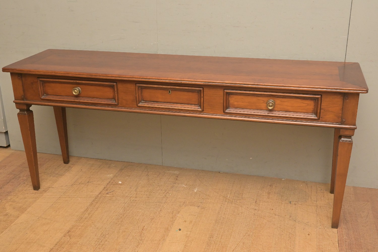 A FRENCH PROVINCIAL STYLE CHERRYWOOD THREE DRAWER HALL TABLE (79H X 190W X 51D CM) (PLEASE NOTE THIS HEAVY ITEM MUST BE REMOVED BY CARRIERS AT THE CUSTOMER'S EXPENSE. LEONARD JOEL STAFF CANNOT ASSIST CARRYING THIS ITEM) (X-LARGE ITEM)