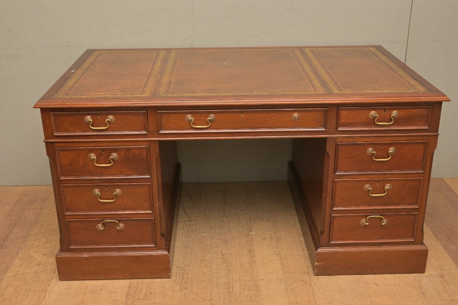 AN ANTIQUE STYLE TWIN PEDESTAL PARTNER'S DESK (A/F) (79H X 153W X 92D CM) (PLEASE NOTE THIS HEAVY ITEM MUST BE REMOVED BY CARRIERS AT THE CUSTOMER'S EXPENSE. LEONARD JOEL STAFF CANNOT ASSIST CARRYING THIS ITEM) (X-LARGE ITEM)