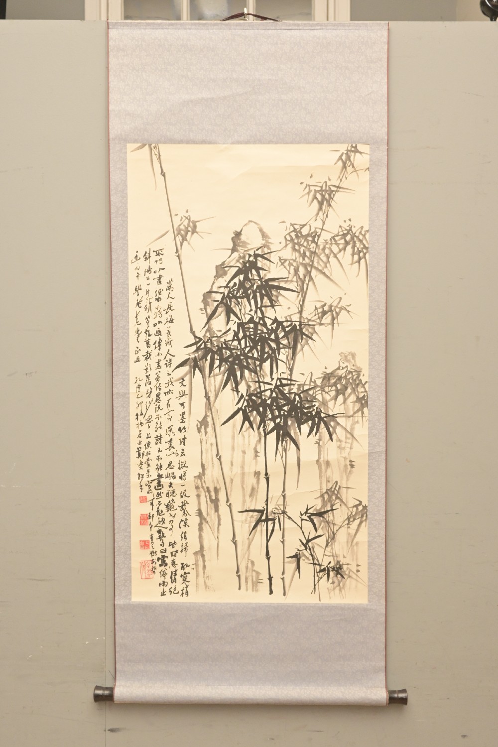 CHINESE SCHOOL, 20TH CENTURY. EXTENSIVELY INSCRIBED AND SEALED. BAMBOO, BLACK INK WASH ON PAPER, MOUNTED ON A SILK SCROLL (94 X 48CM - PAPER SHEET) (LEONARD JOEL DELIVERY SIZE: MEDIUM)