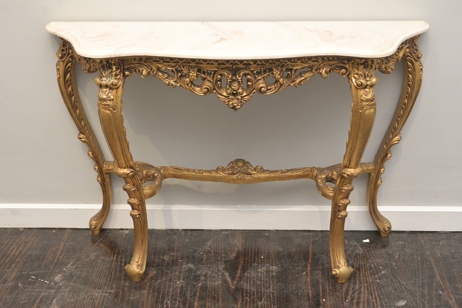 A LOUIS XV-STYLE MARBLE-TOPPED GILT WOOD CONSOLE (A/F) (79H X 117W X 33D CM) LEONARD JOEL DELIVERY SIZE: X-LARGE)