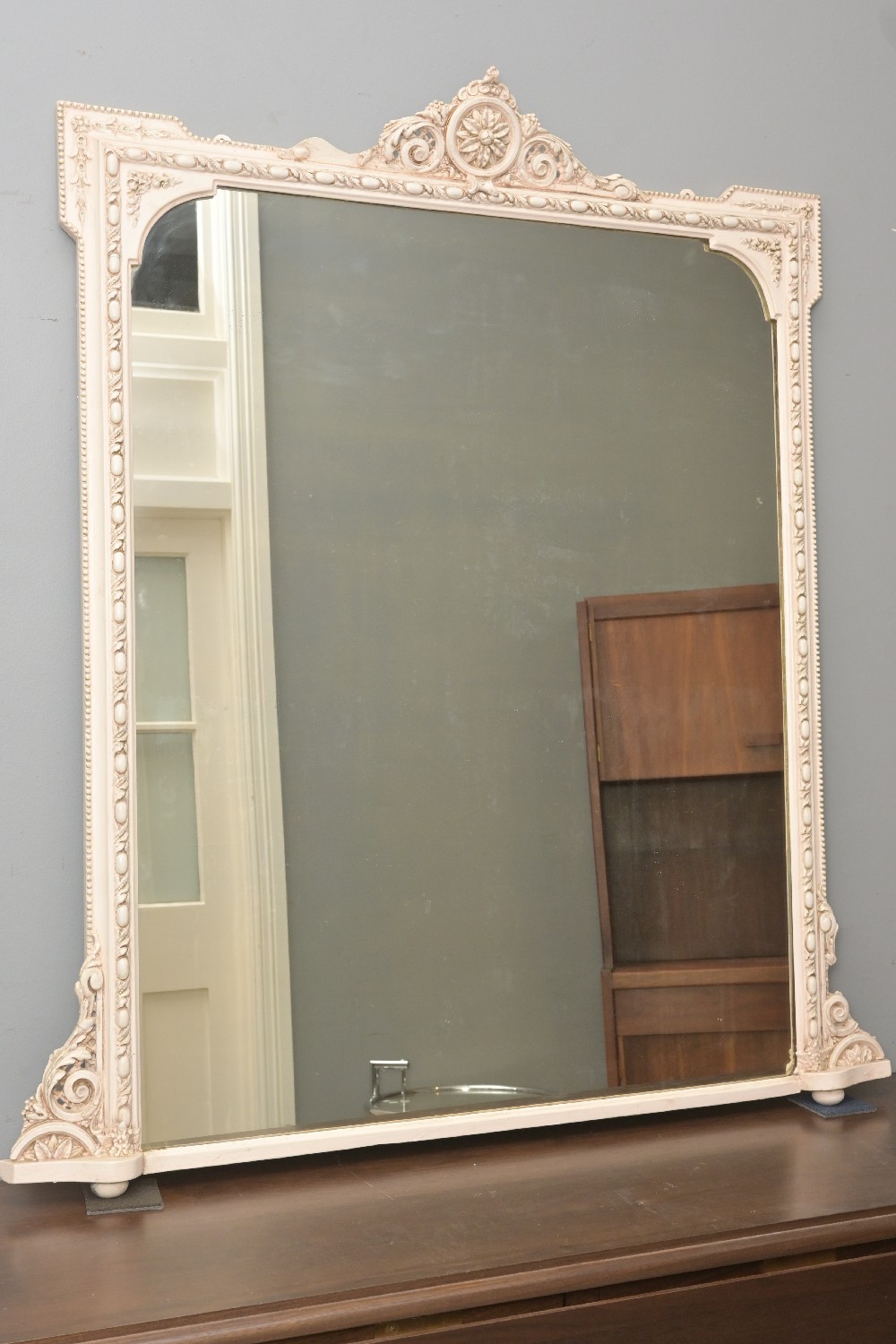 AN OVERMANTEL MIRROR IN LOUIS XVI MANNER, THE FRAME PROBABLY ANTIQUE (LATE 19TH C.) AND ORIGINALLY GILT BUT NOW PAINTED CREAM (A/F) (143 X 139 CM) (PLEASE NOTE THIS HEAVY ITEM MUST BE REMOVED BY CARRIERS AT THE CUSTOMER'S EXPENSE. LEONARD JOEL STAFF CANNOT ASSIST CARRYING THIS ITEM) (X-LARGE ITEM)