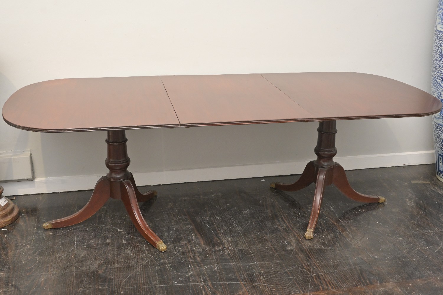 A REGENCY-STYLE HARDWOOD TWO-PEDESTAL EXTENDING DINING TABLE (A/F) (MISSING CLIPS) (72H X 223W X 99D CM) (PLEASE NOTE THIS HEAVY ITEM MUST BE REMOVED BY CARRIERS AT THE CUSTOMER'S EXPENSE. LEONARD JOEL STAFF CANNOT ASSIST CARRYING THIS ITEM) (X-LARGE ITEM)