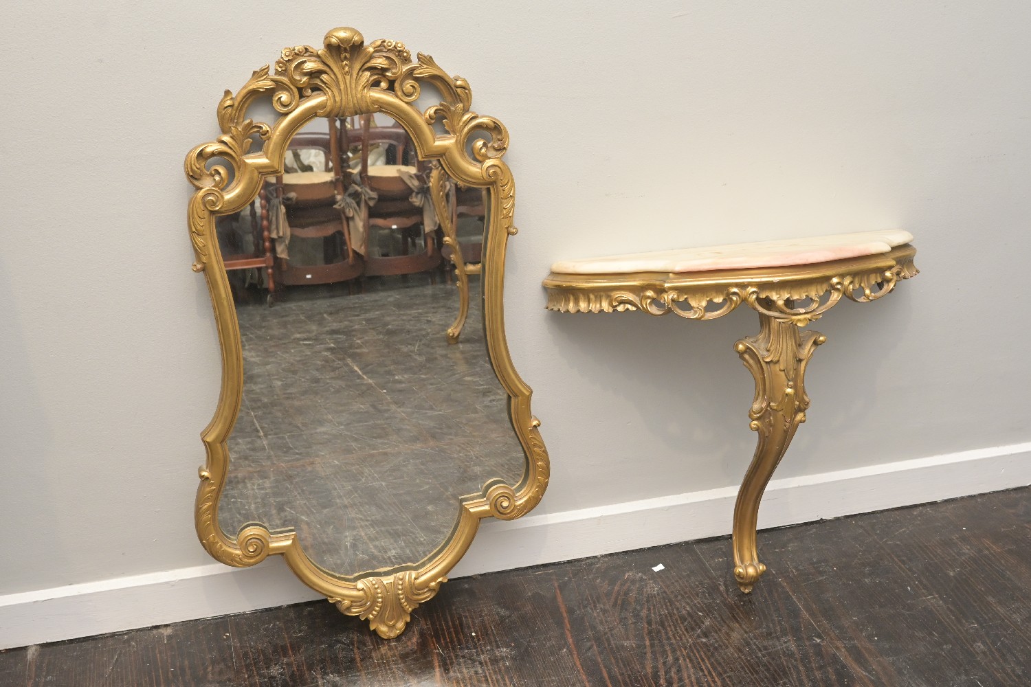 A GILT-FRAMED WALL MIRROR IN LOUIS XV MANNER AND MATCHING SMALL WALL-MOUNTED CONSOLE (A/F) (102H X 60W CM) LEONARD JOEL DELIVERY SIZE: LARGE)