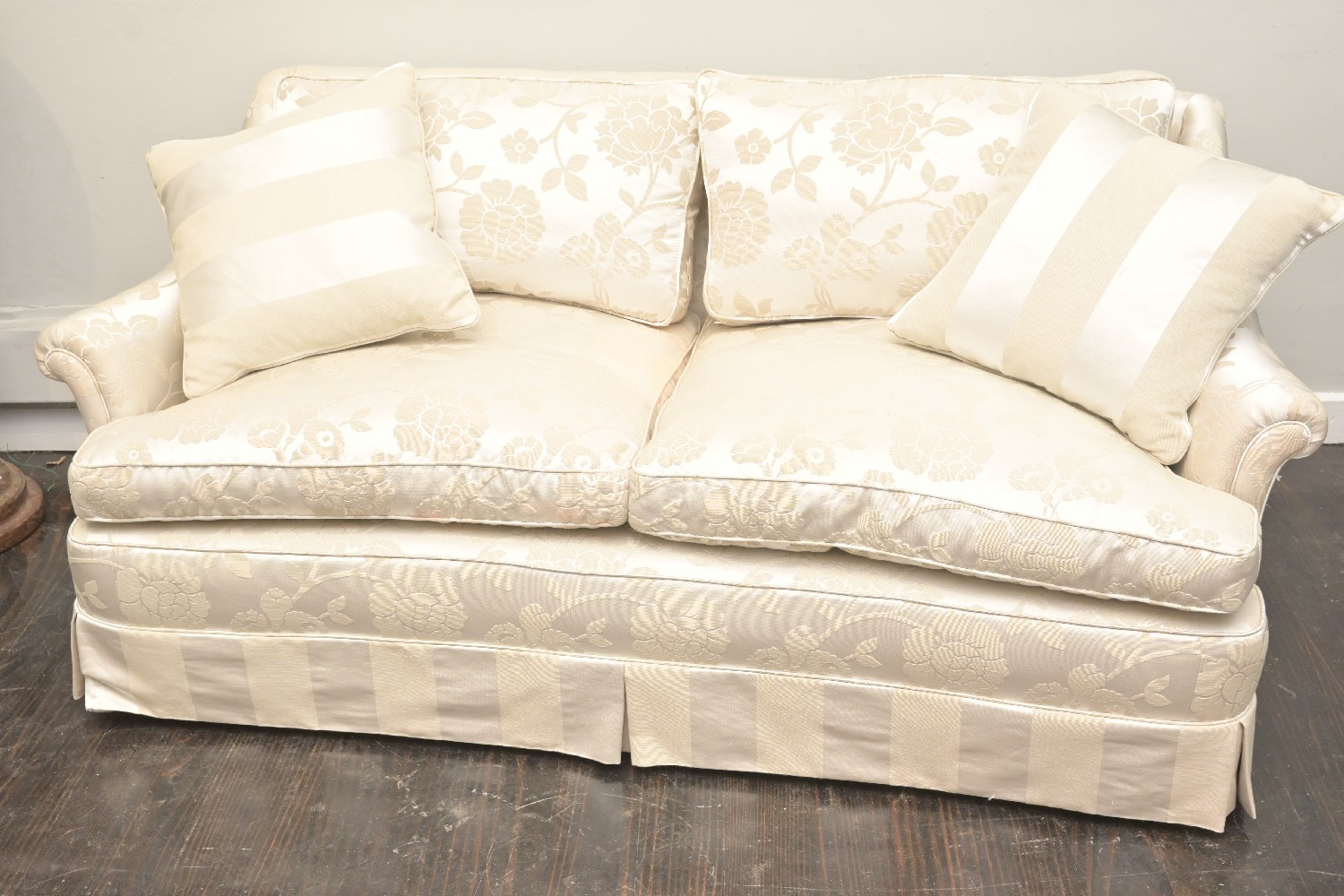 A GOOD TWO-SEAT SOFA IN IVORY DAMASK (A/F) (73H X 156W X 80D CM) (PLEASE NOTE THIS HEAVY ITEM MUST BE REMOVED BY CARRIERS AT THE CUSTOMER'S EXPENSE. LEONARD JOEL STAFF CANNOT ASSIST CARRYING THIS ITEM) (X-LARGE ITEM)