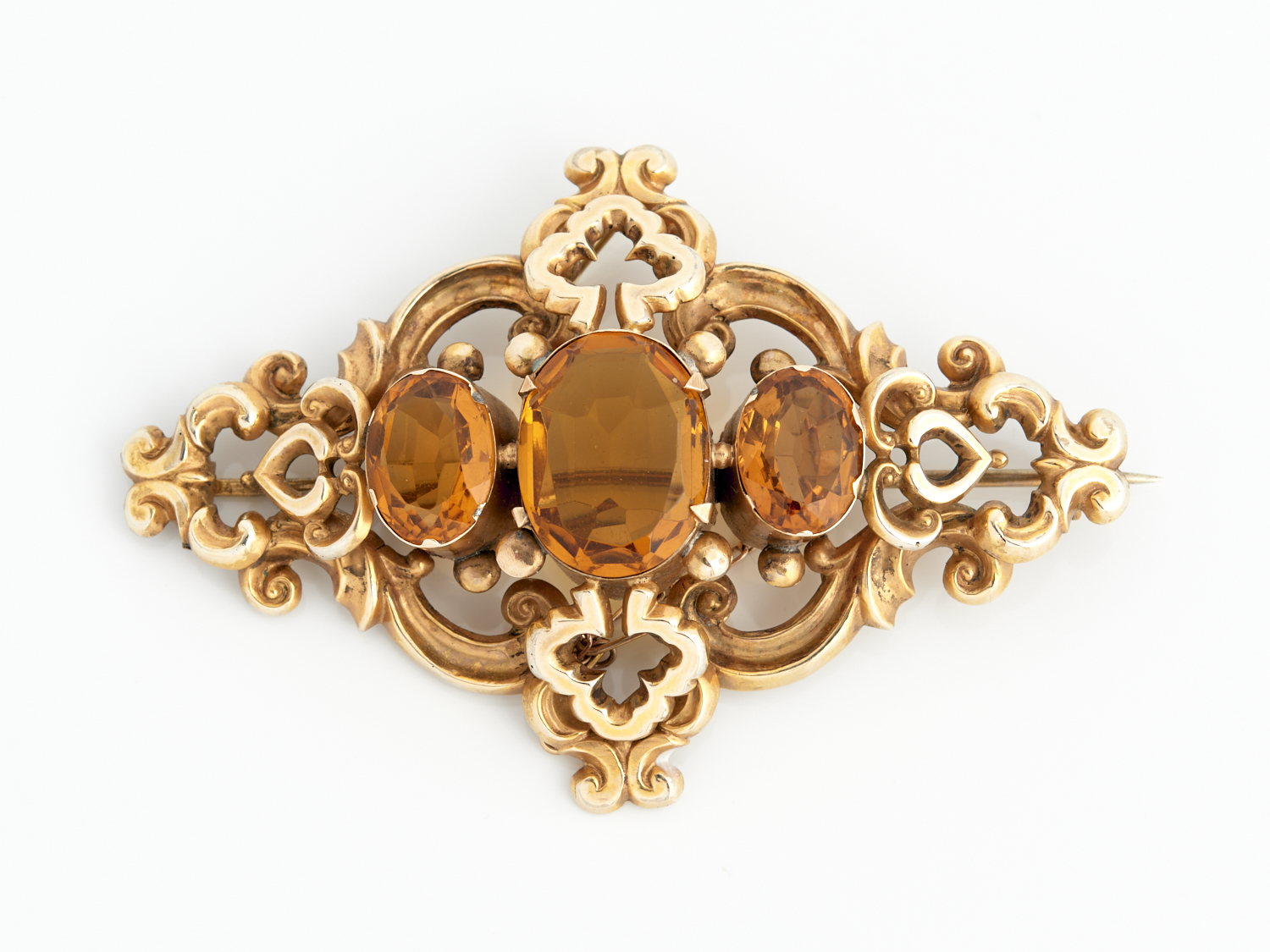 A CITRINE BROOCH IN GOLD PLATE, 50 X 75MM, 23.7GMS