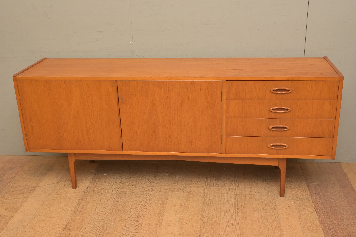 A MID-CENTURY TEAK VENEERED TWO DOOR FOUR DRAWER SIDEBOARD (76H X 183W X 46D CM) (PLEASE NOTE THIS HEAVY ITEM MUST BE REMOVED BY CARRIERS AT THE CUSTOMER'S EXPENSE. LEONARD JOEL STAFF CANNOT ASSIST CARRYING THIS ITEM) (X-LARGE ITEM)