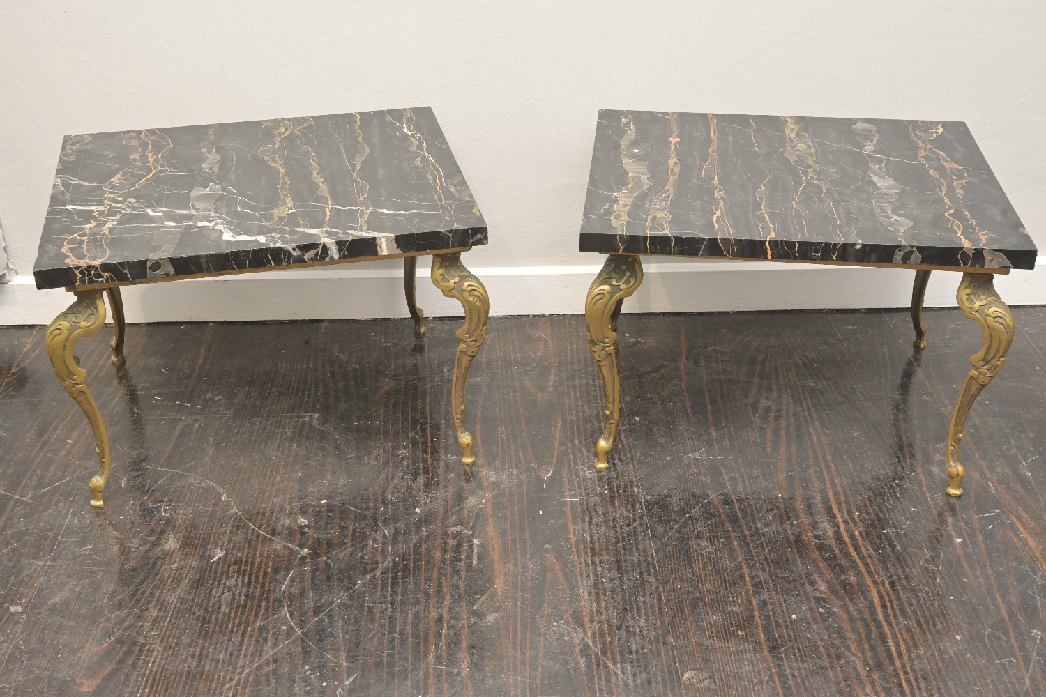 A PAIR OF GILT-METAL-BASED MARBLE-TOPPED SIDE TABLES (A/F) (43H X 62W X 53D CM) (PLEASE NOTE THIS HEAVY ITEM MUST BE REMOVED BY CARRIERS AT THE CUSTOMER'S EXPENSE. LEONARD JOEL STAFF CANNOT ASSIST CARRYING THIS ITEM) (X-LARGE ITEM)