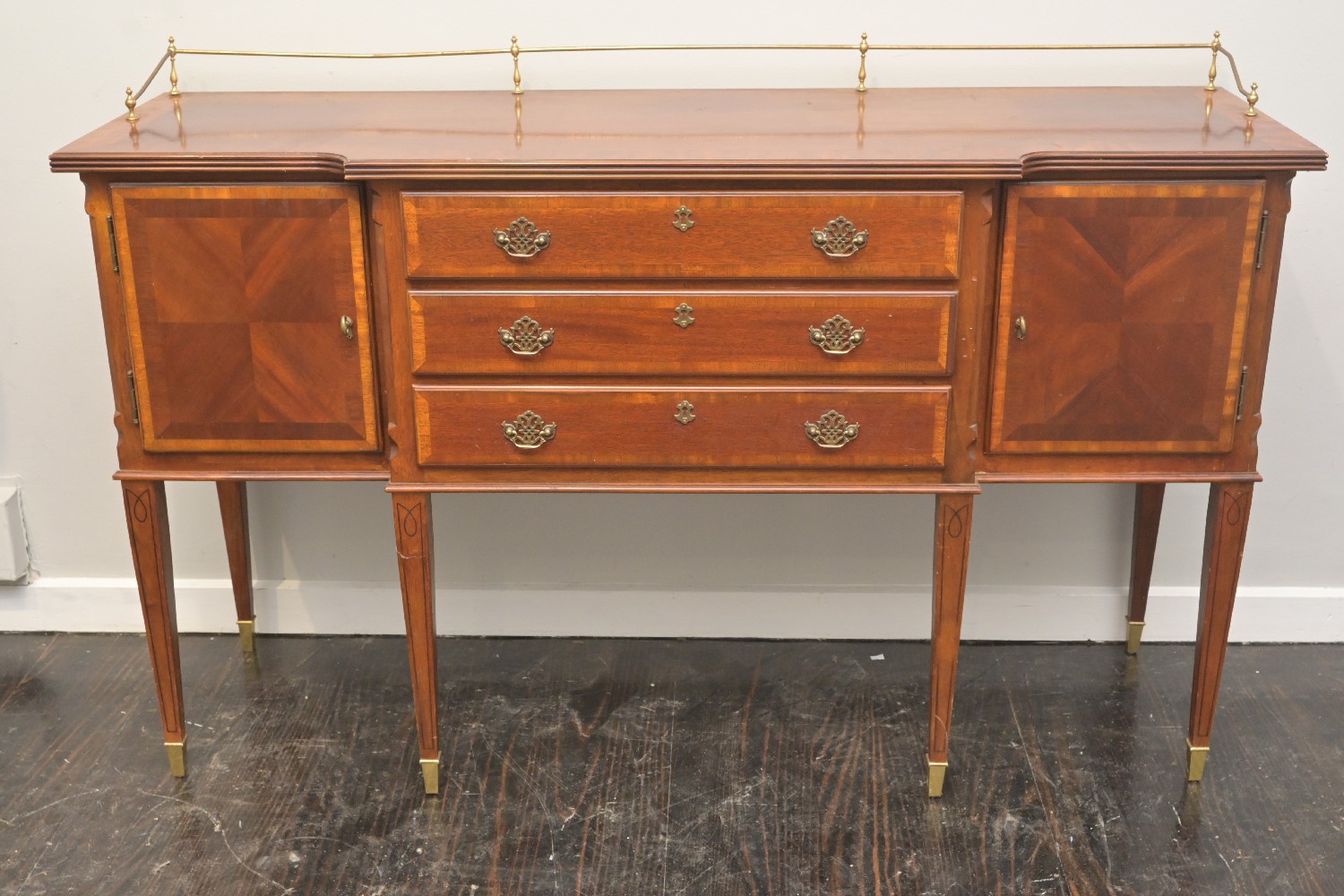 A GEORGIAN-STYLE SIDEBOARD, WITH BRASS CURTAIN RAIL BACK (104H X 162W X 50D CM) (PLEASE NOTE THIS HEAVY ITEM MUST BE REMOVED BY CARRIERS AT THE CUSTOMER'S EXPENSE. LEONARD JOEL STAFF CANNOT ASSIST CARRYING THIS ITEM) (X-LARGE ITEM)