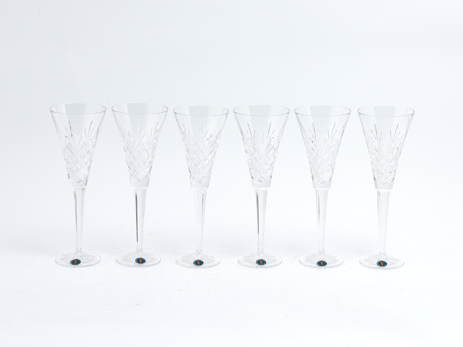 A SET OF SIX WATERFORD CRYSTAL CHAMPAGNE FLUTES WITH ORIGINAL BOXES H.26CM, LEONARD JOEL DELIVERY SIZE: MEDIUM