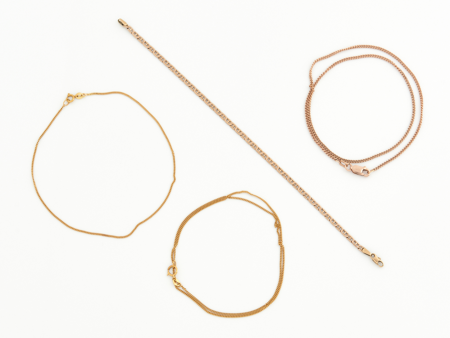 TWO CHAINS IN 18CT GOLD, A CHAIN IN 9CT GOLD, A BRACELET IN 9CT GOLD, 11.1GMS