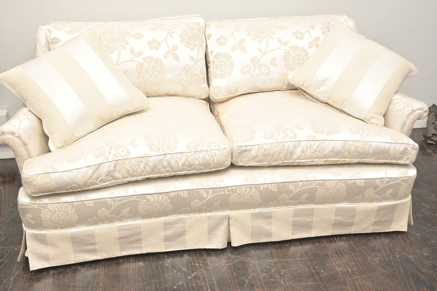 A GOOD TWO-SEAT SOFA IN IVORY DAMASK (A/F) (73H X 156W X 80D CM) (PLEASE NOTE THIS HEAVY ITEM MUST BE REMOVED BY CARRIERS AT THE CUSTOMER'S EXPENSE. LEONARD JOEL STAFF CANNOT ASSIST CARRYING THIS ITEM) (X-LARGE ITEM)