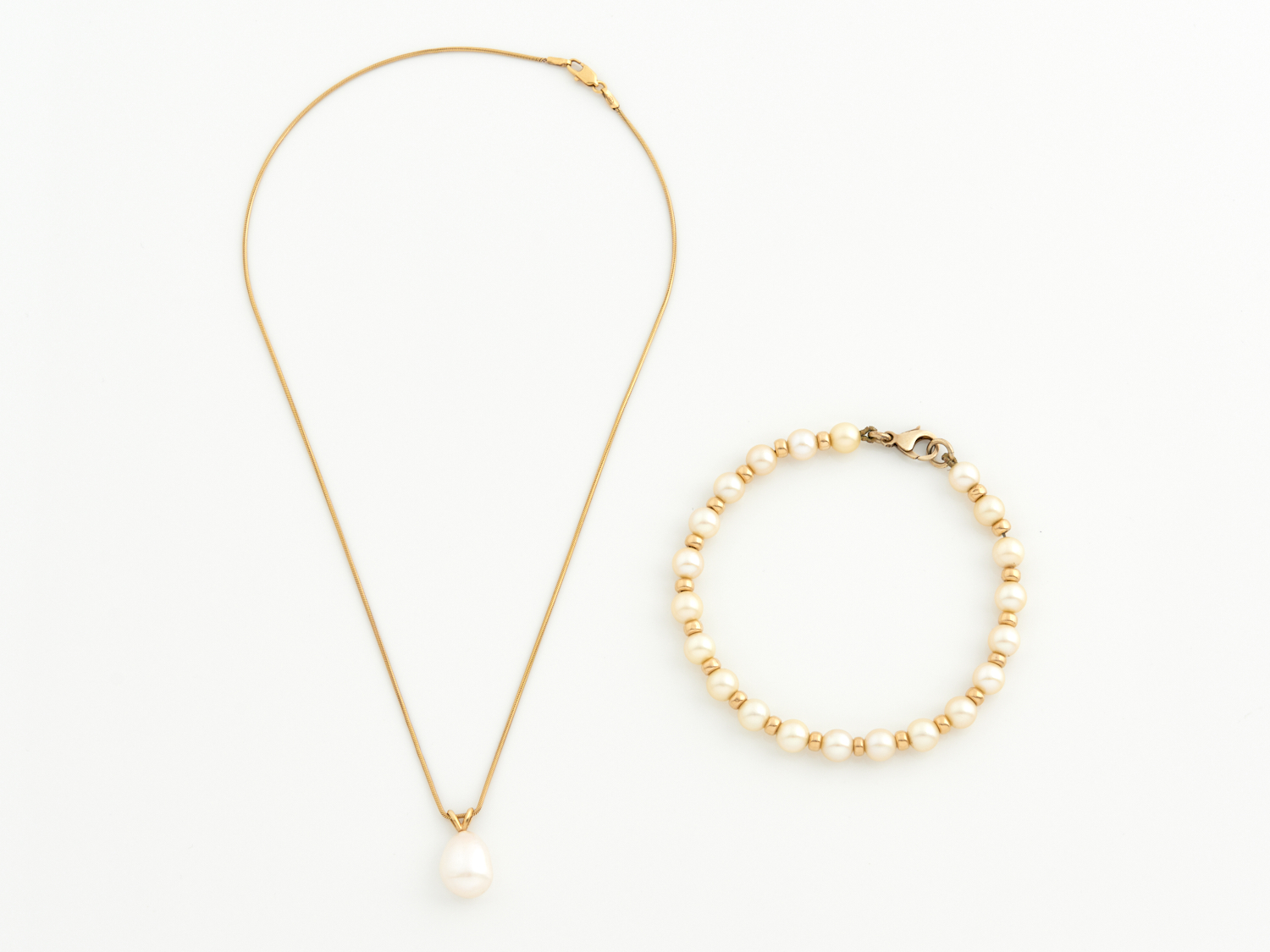 A PEARL BRACELET TO A CLASP IN GOLD PLATE, TOGETHER WITH A BAROQUE PEARL PENDANT TO A CHAIN IN 9CT GOLD, 400MM