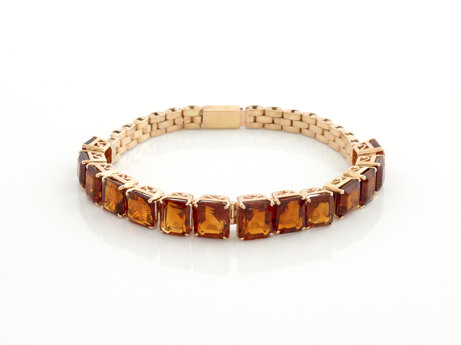 A VINTAGE RETRO 1940'S CITRINE BRACELET IN 12CT ROSE GOLD, THE CITRINE TOTALLING APPOXIMATELY 20CT,170MM, 20.6GMS