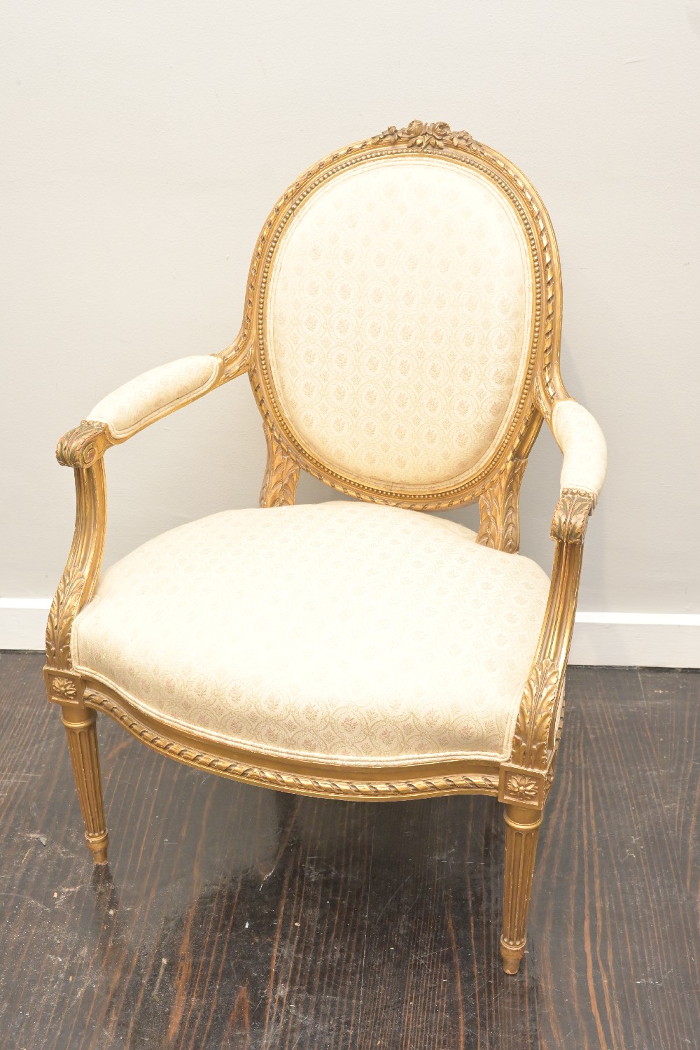 A LOUIS XVI-STYLE GILT WOOD AND UPHOLSTERED FAUTEUIL (A/F) (92H X 66W X 54D CM) (LEONARD JOEL DELIVERY SIZE: LARGE)