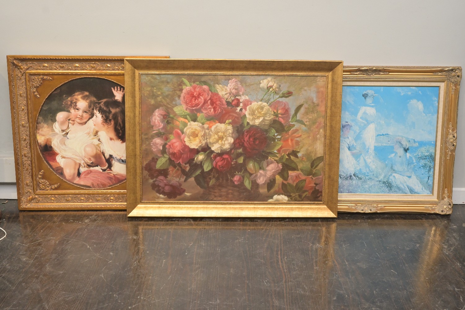 THREE ANTIQUE STYLE GILT FRAMES, EACH CONTAINING A REPRODUCTION PRINT (85H X 116W CM) LEONARD JOEL DELIVERY SIZE: X-LARGE)