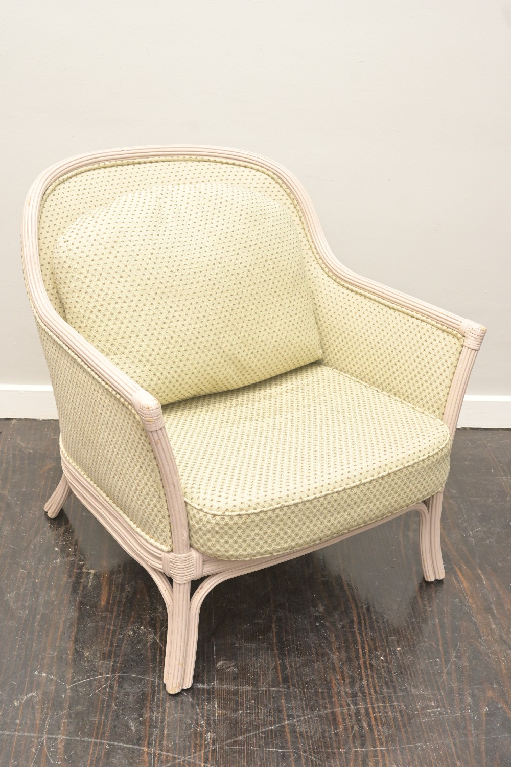 A FRENCH STYLE WHITE CANE AND UPHOLSTERED ARMCHAIR (A/F) (82H X 76W X 81D CM) (LEONARD JOEL DELIVERY SIZE: X-LARGE)