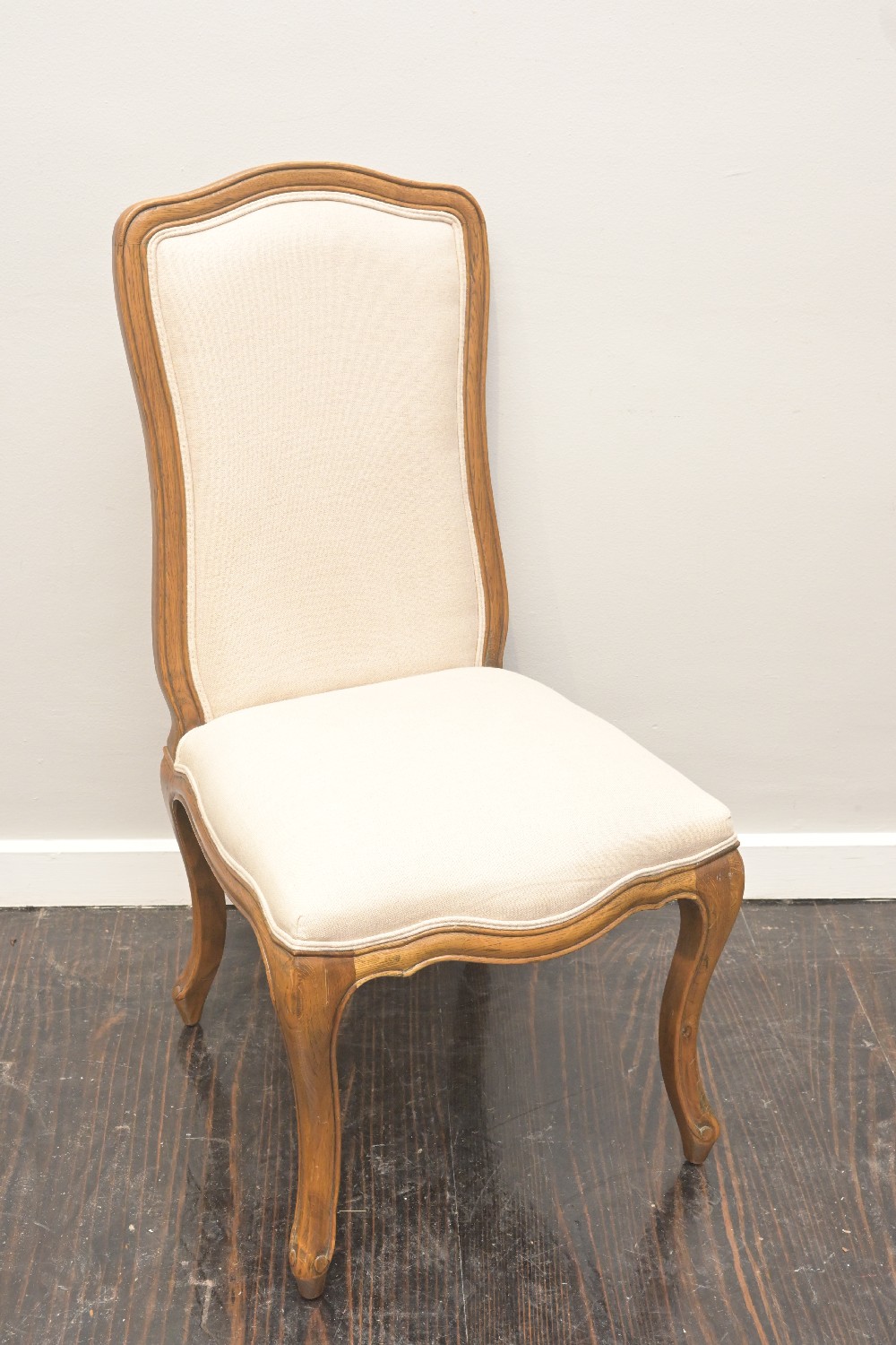 A FRENCH STYLE OAK CREAM-UPHOLSTERED HIGHBACK CHAIR (101H X 50W X 53D CM) (LEONARD JOEL DELIVERY SIZE: LARGE)