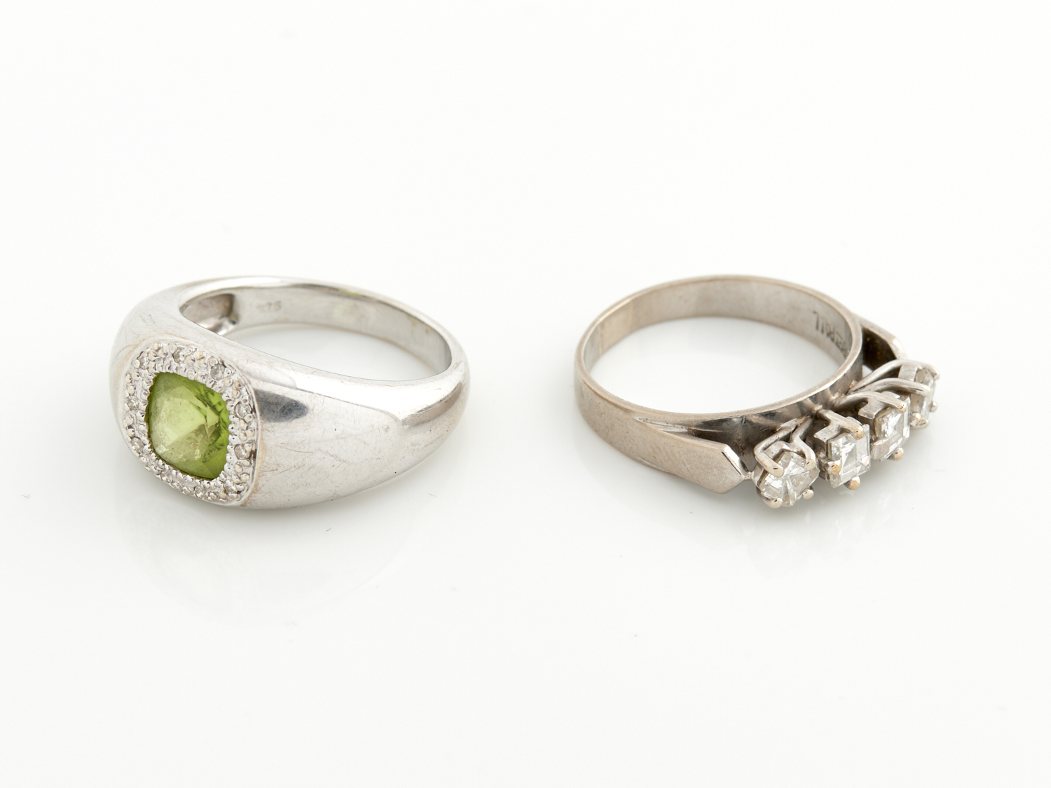 A FOUR STONE DIAMOND RING IN 18CT WHITE GOLD TOGETHER WITH A PERIDOT RING IN 9CT WHITE GOLD, SIZE O, TOTAL WEIGHT 10.5GMS