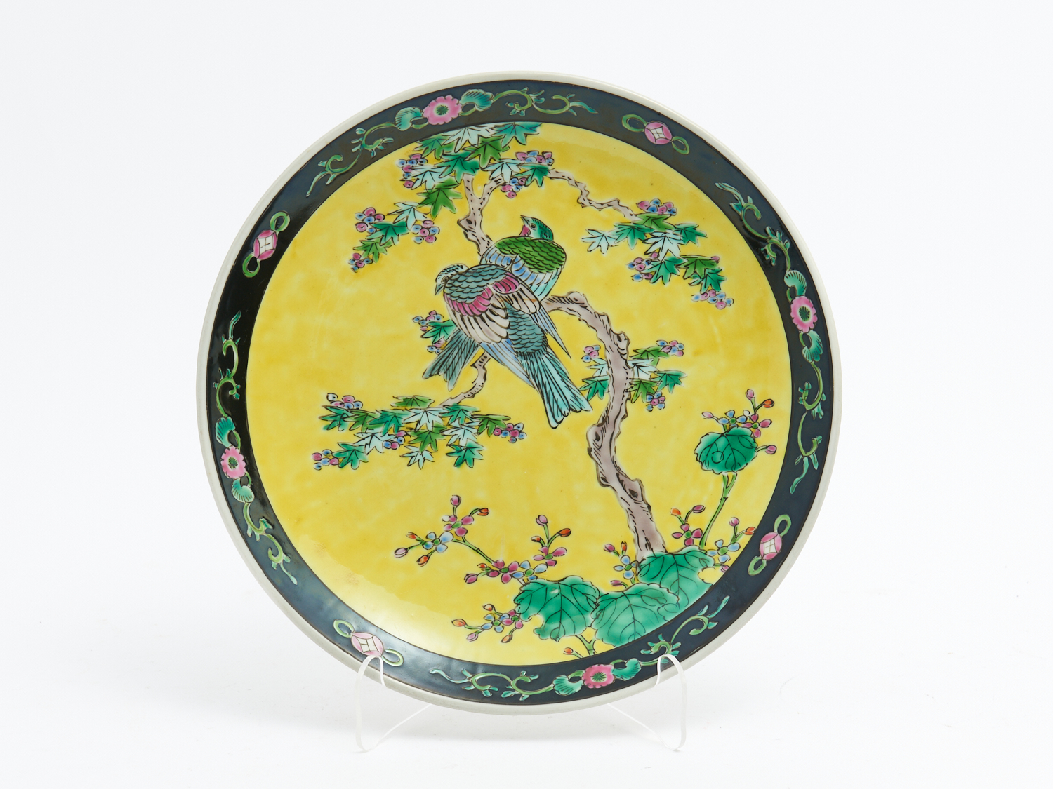 A FAMILLE JAUNE PLATE DECORATED WITH BIRD ON FOLIAGE DIA.20CM, LEONARD JOEL DELIVERY SIZE: SMALL