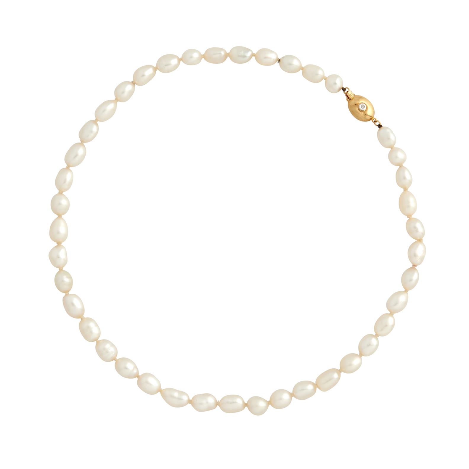 Comprising forty-one pearls of silver-white hues measuring approximately 6.50mm to 7.90mm, completed by diamond set tongue and groove clasp in 18ct gold, unsigned, length 455mm.