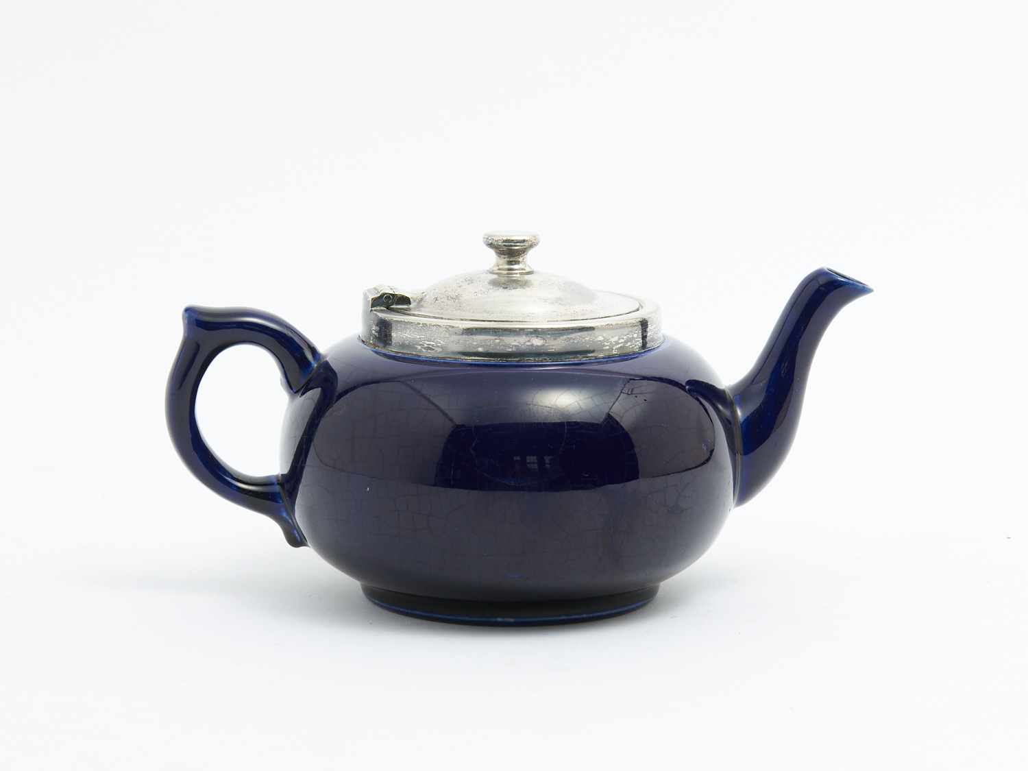 A CERAMIC AND SILVER PLATE MOUNTED ROBUR PERFECT TEAPOT (A/F) L.22CM, LEONARD JOEL DELIVERY SIZE: SMALL