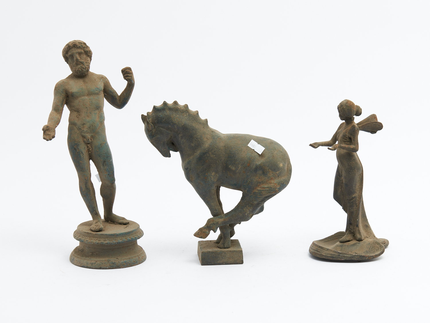 THREE CAST IRON REPRODUCTION FIGURES INCLUDING ART NOUVEAU AND CLASSICAL H.29CM (TALLEST), LEONARD JOEL DELIVERY SIZE: MEDIUM
