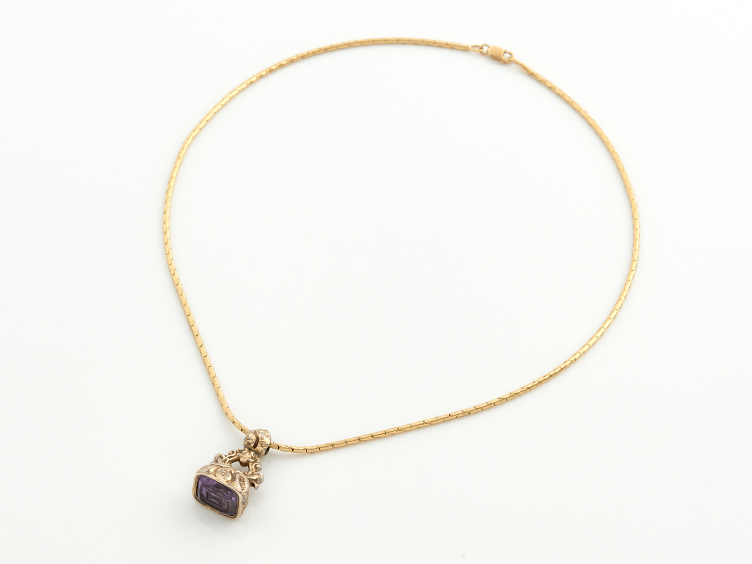 A CARVED AMETHYST SEAL IN GOLD TONE METAL, TO A SNAKE LINK CHAIN IN 18CT, 410MM, TOTAL WEIGHT 15.2GMS