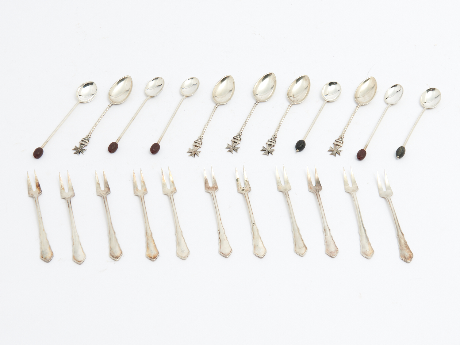 THREE SETS OF SILVER SPOONS AND FRUIT FORKS INCLUDING 800 AND STERLING SILVER 214G, L.10.5CM (LONGEST), LEONARD JOEL DELIVERY SIZE: SMALL
