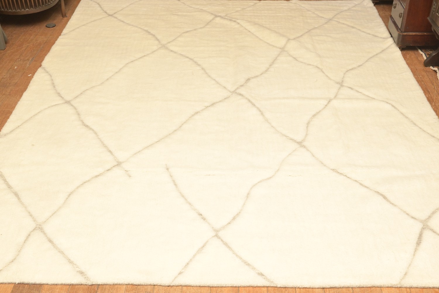 A DECORATIVE MOROCCAN STYLE, HAND MADE DESIGNER RUG. 100% PLUSH WOOL PILE. IN TONES OF IVORY AND GREY. SIZE: 244 X 305 CM ORIGIN: INDIA – RRP: $2,800 DOCUMENTATION OF AUTHENTICITY INCLUDED.
