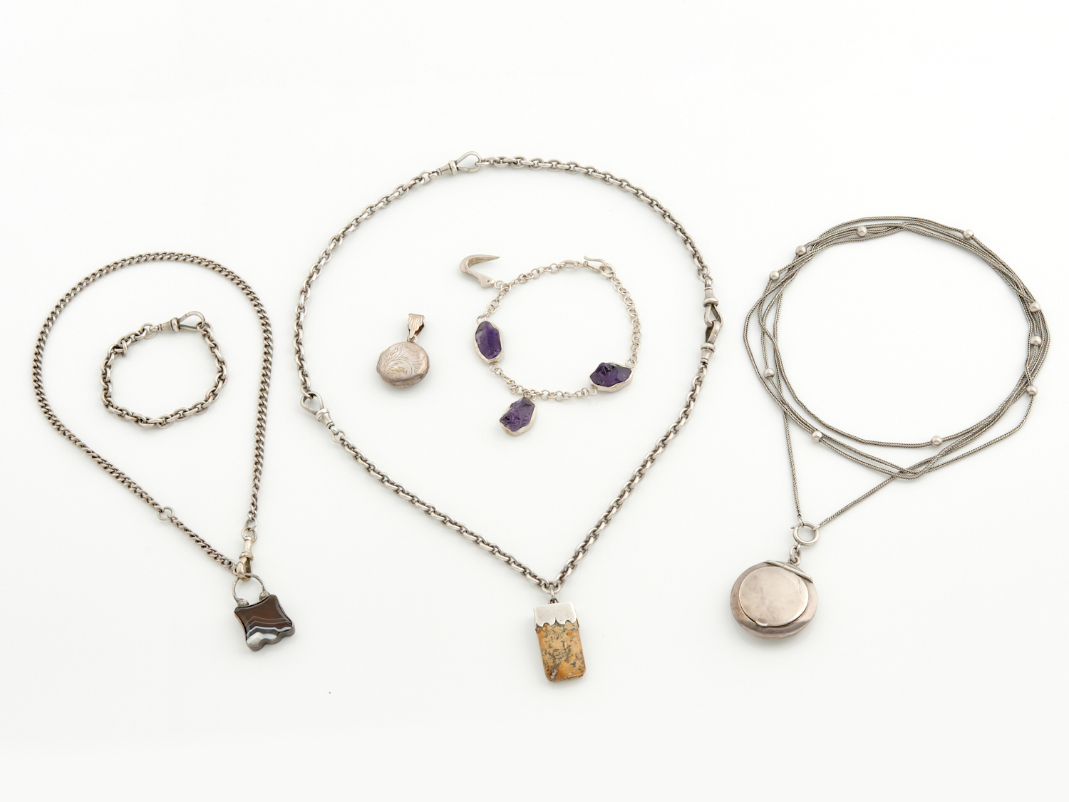 A COLLECTION OF JEWELLERY IN SILVER, COMPRISING A FOB CHAIN, GUARD CHAIN, NECKLACE, BRACELET AND PENDANT, INCLUDING ONE AMETHYST SET IN SILVER PLATE