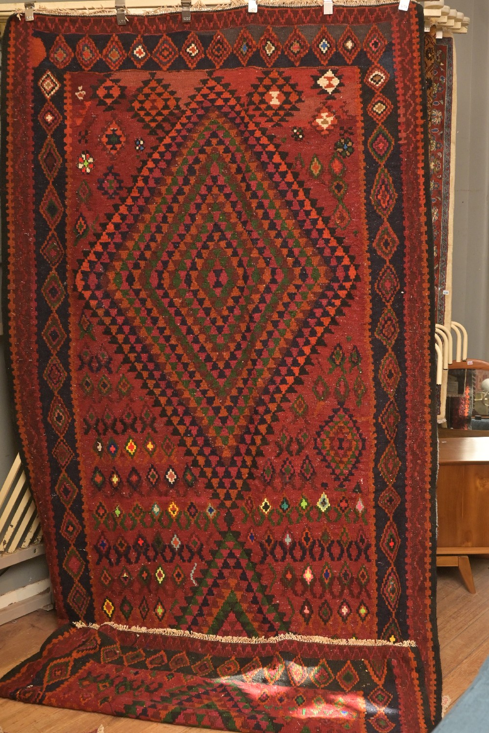A LARGE REVERSIBLE TRIBAL PERSIAN SHIRAZ KILIM. HAND WOVEN, 100% WOOL AND NATURAL DYES. COLOURFUL DIAMOND AND TRIBAL MOTIFS. SIZE: 355 X 165 CM - RRP-$800- ORIGIN: PERSIA DOCUMENTATION OF AUTHENTICITY INCLUDED.