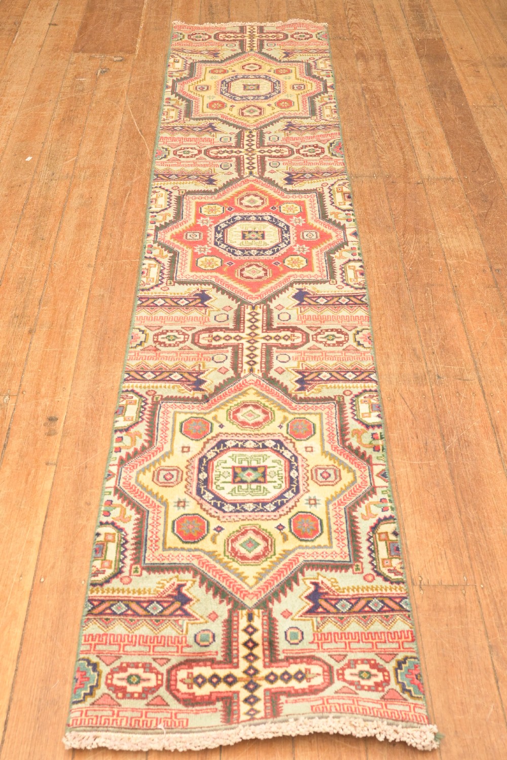 A SOLID COLOURFUL PERSIAN TABATABAEI TABRIZ RUNER, 100% WOOL, MINOR SEMI VINTAGE PILE. WITH CONTINUING CENTRAL STAR FLORAL MEDALLIONS IN TONES OF GOLD, RED AND MAGENTA ON MINT GREEN FIELD, WITH TRIBAL GEOMETRIC MOTIFS AND AMULETS. SIZE: 273 X 55 CM - ORIGIN: PERSIA DOCUMENTATION OF AUTHENTICITY INCLUDED.