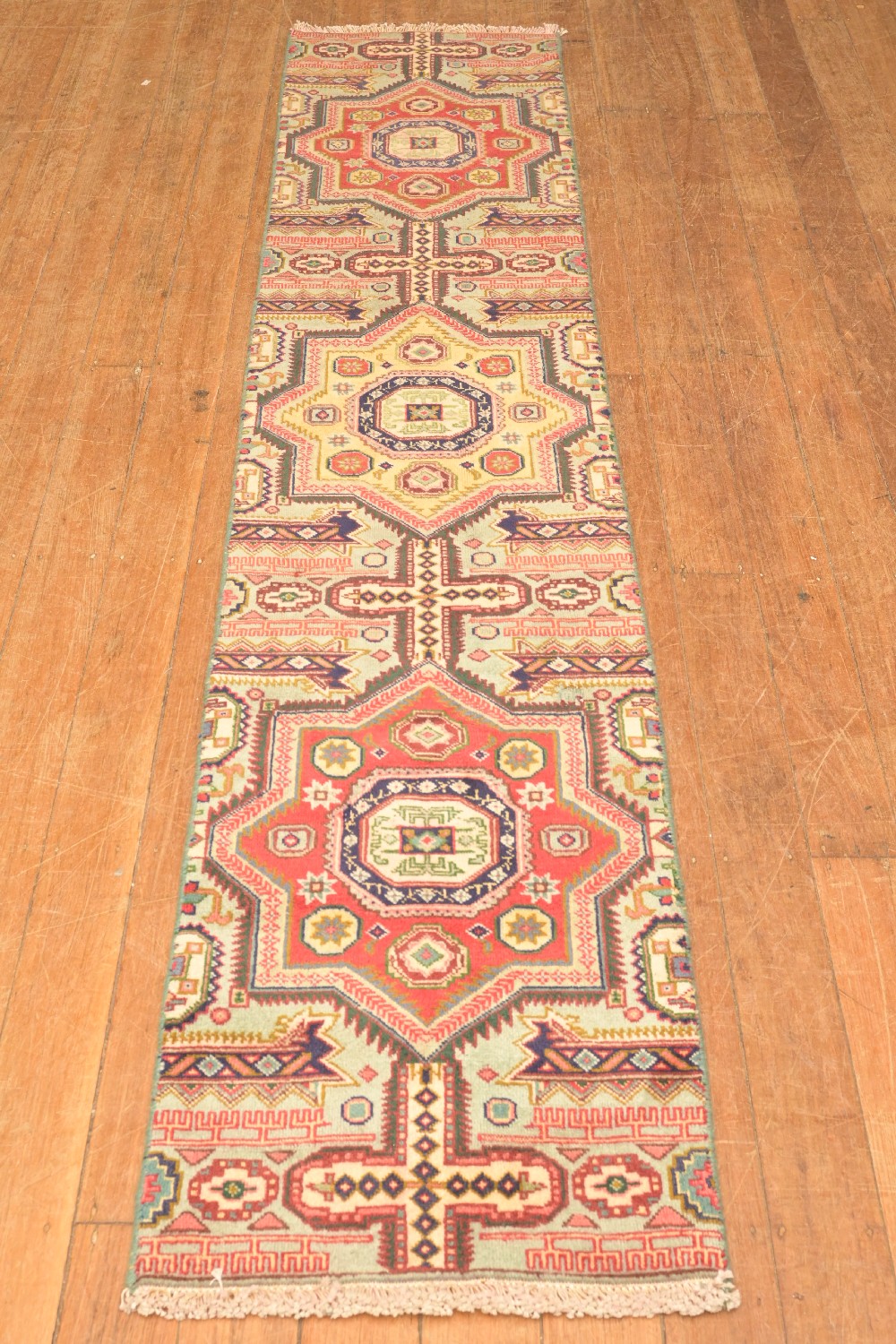 A SOLID COLOURFUL PERSIAN TABATABAEI TABRIZ RUNER, 100% WOOL, MINOR SEMI VINTAGE PILE. WITH CONTINUING CENTRAL STAR FLORAL MEDALLIONS IN TONES OF GOLD, RED AND MAGENTA ON MNT GREN FIELD. WITH TRIBAL AND GEOMETRIC MOTIFS AND AMULETS. SIZE: 273 X 55 CM -ORIGIN: PERSIA DOCUMENTATION OF AUTHENTICITY INCLUDED.