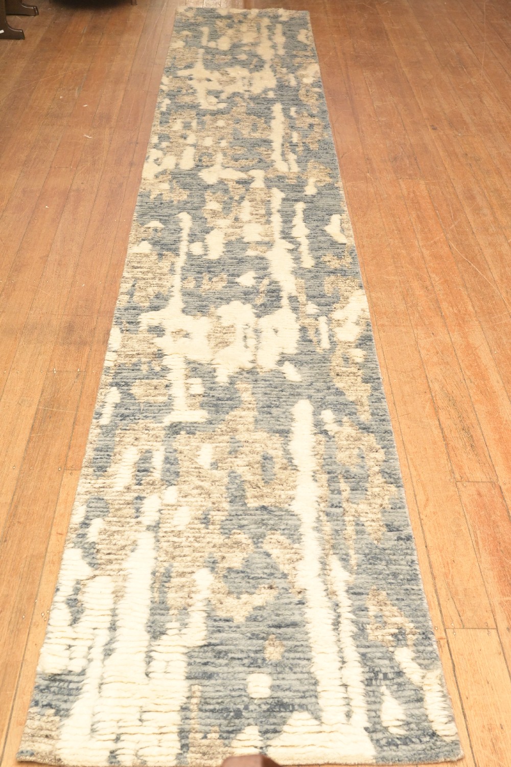 A LONG MOROCCAN BERBER RUNNER. 100% WOOL PLUSH PILE, HANDLOOMED IN MULTI COLOUR TONES. SIZE: 498 X 80 CM ORIGIN: INDIA – RRP: $1,500 DOCUMENTATION OF AUTHENTICITY INCLUDED