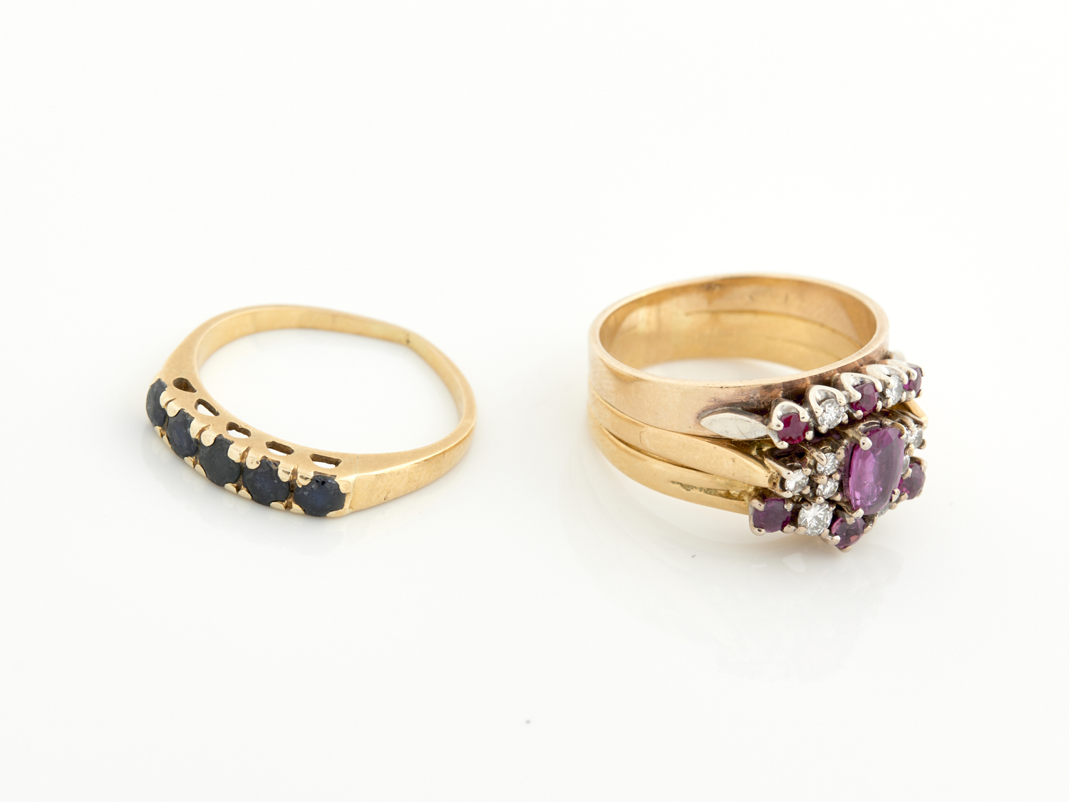 A RUBY AND DIAMOND RING SUITE IN 18CT AND 9CT GOLD, TOGETHER WITH A SAPPHIRE RING IN 18CT GOLD, SIZE M 1/2 AND O, 10.9GMS