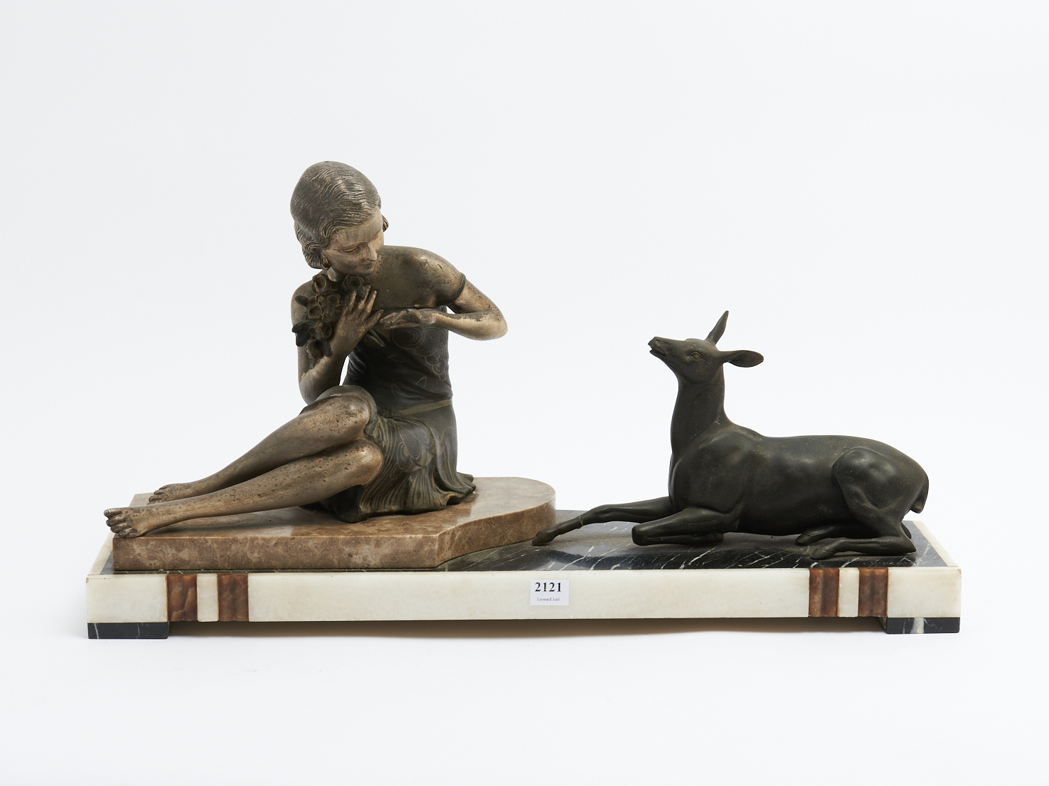 AN ART DECO SPELTER, ALABASTER AND MARBLE CENTER PIECE OF SEATED A WOMAN WITH DEER, SIGNED CIPRIANI L.57CM, LEONARD JOEL DELIVERY SIZE: LARGE