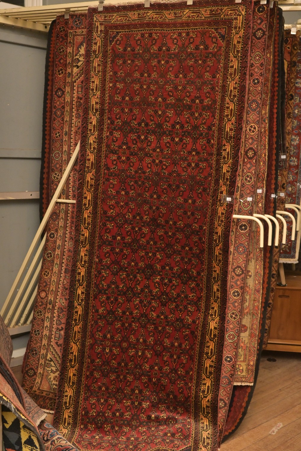 A PERSIAN HAMADAN HALL RUNNER. 100% WOOL PILE. VILLAGE WEAVE FROM THE HAMADAN REGION WITH A DESIGN OF ALL-OVER FLORAL HERATI MAHI PATTERNS ON A SOFT RED FIELD. MINOR BORDER OF PAISLEY MOTIFS, MAJOR BORDER OF SERABAND DESIGN GEOMETRIC AND FLORAL MOTIFS. SIZE: 296 X 100 CM ORIGIN: PERSIA – RRP: $1,500 DOCUMENTATION OF AUTHENTICITY INCLUDED.