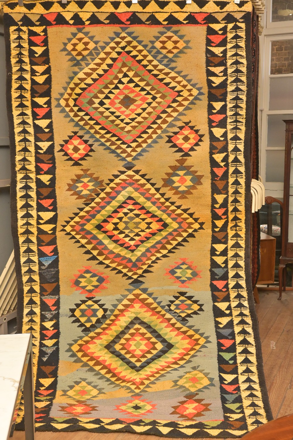 A TRIBAL PERSIAN SHIRAZ KILIM. HAND WOVEN- NATURAL DYES, CHENILLE COTTON. COLOURFUL TRIPLE DIAMOND DESIGN AND GEOMETRIC MOTIFS. SIZE: 300 X 162 CM - ORIGIN: PERSIA