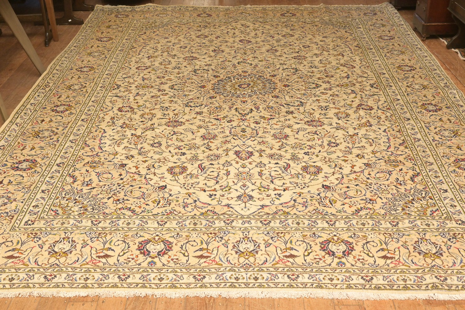 A PERSIAN CREAM KASHAN CARPET. WITH 100% WOOL PILE, SOLID AND DENSE. HAND KNOTTED IN TRADITIONAL DESIGN OF CENTRAL SUNBURST MEDALLION, WITH ALL OVER SHA ABBASI PALMETTES, TENDRILS AND FLORAL SPRAYS. WITH HINTS OF EMERALD GREEN, FRENCH BLUE AND NAVY BLUE. BORDER OF PALMETTES, FLORAL AND PARROT BIRD MOTIFS. SIZE: 400 X 285 CM ORIGIN: PERSIA – RRP: $5,900 DOCUMENTATION OF AUTHENTICITY INCLUDED.