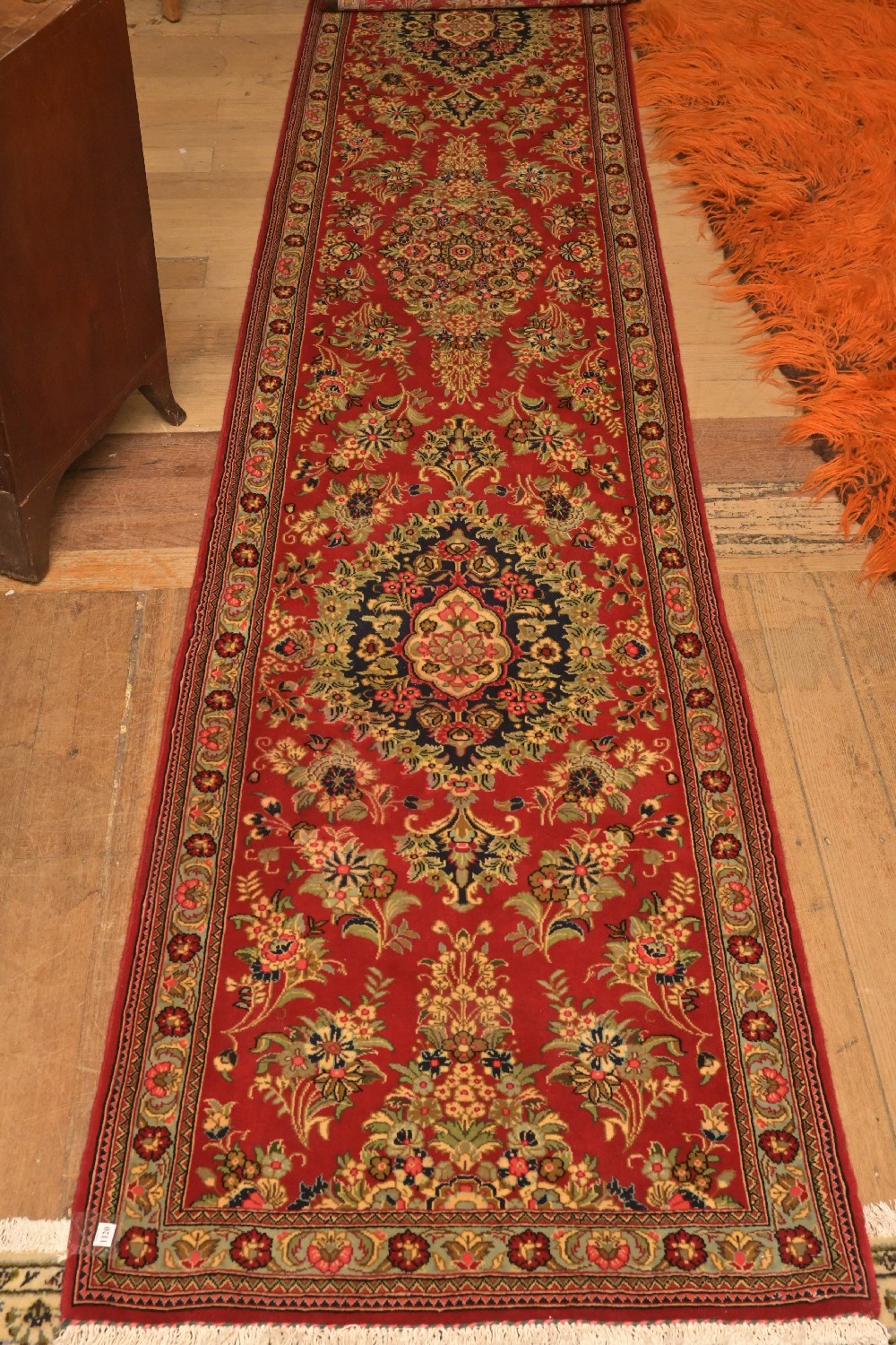 A PERSIAN QUM RUNNER, 100 % FINE LAMBS WOOL. WITH APPROXIMATELY 500,000 KPSM. CONTINUING CENTRAL ELONGATED MEDALLIONS IN PERSIAN BLUE, SAGE GREEN, AND ROSE COLOUR TONES, ON A RUBY RED FIELD OF SAZ LEAVES AND FLORAL SPRAYS. SIZE: 396 X 84 CM ORIGIN: IRAN – RRP: $5,900 DOCUMENTATION OF AUTHENTICITY INCLUDED.