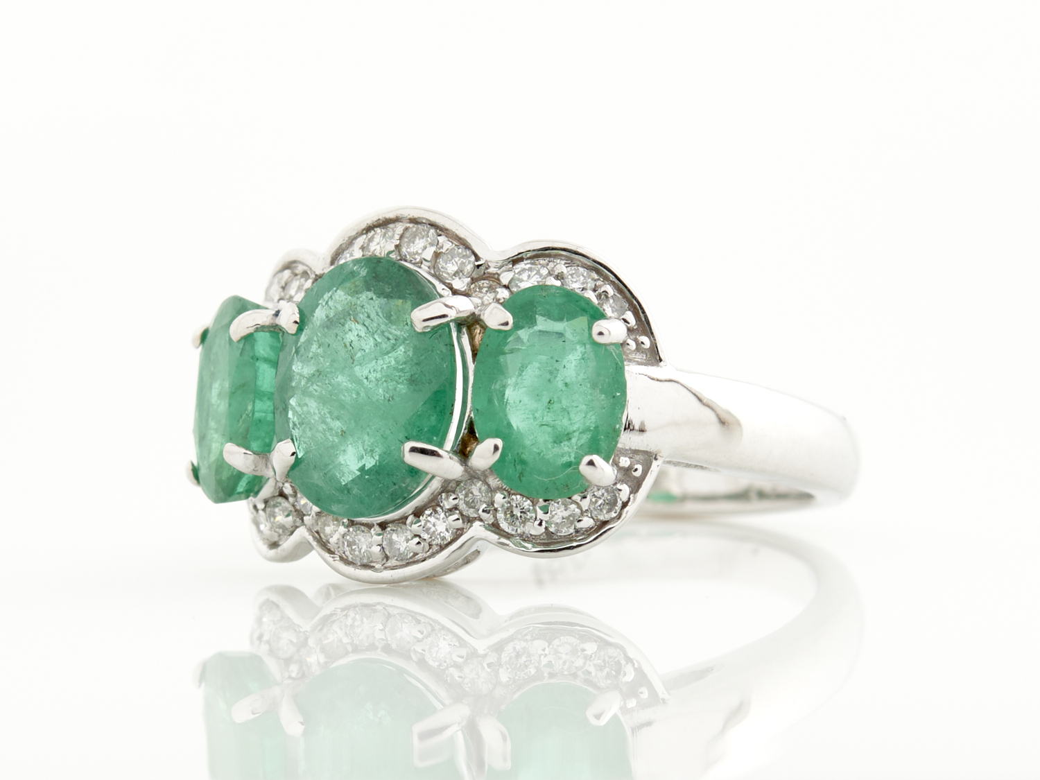 AN EMERALD RING IN 18CT WHITE GOLD, THE EMERALDS TOTALLING 3.10CTS WITH DIAMONDS TOTALLING 0.32CTS, G/SI, SIZE M