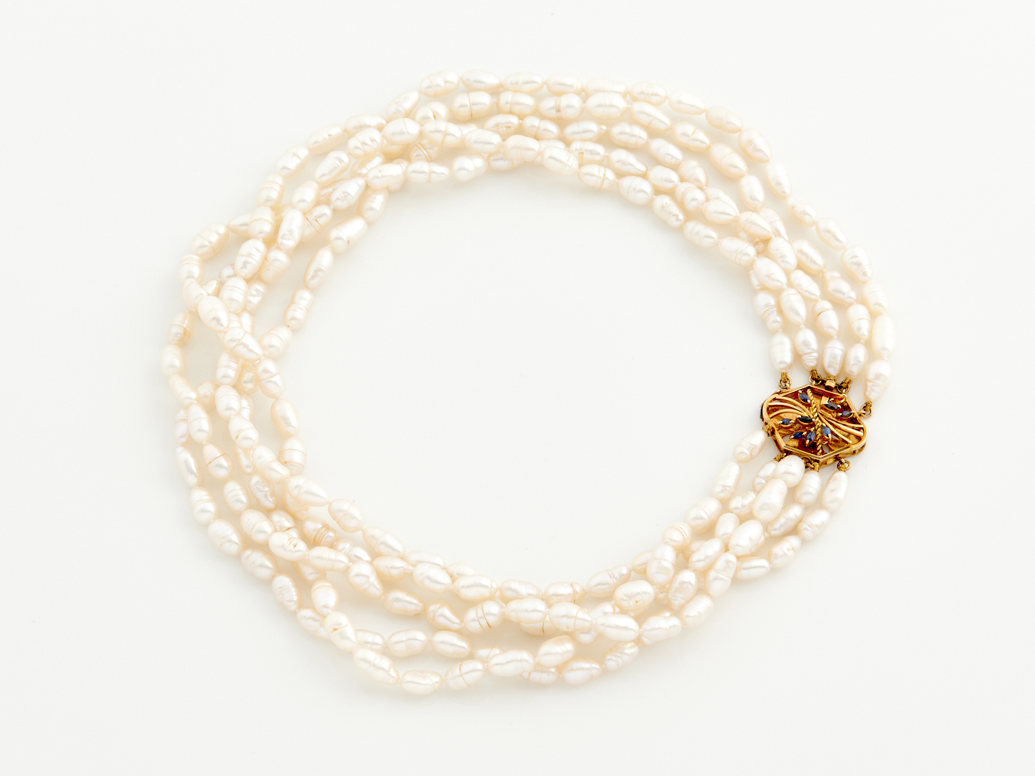 A MULTI STRAND FRESHWATER PEARL NECKLACE TO A SAPPHIRE CLASP IN 14CT GOLD, 400MM