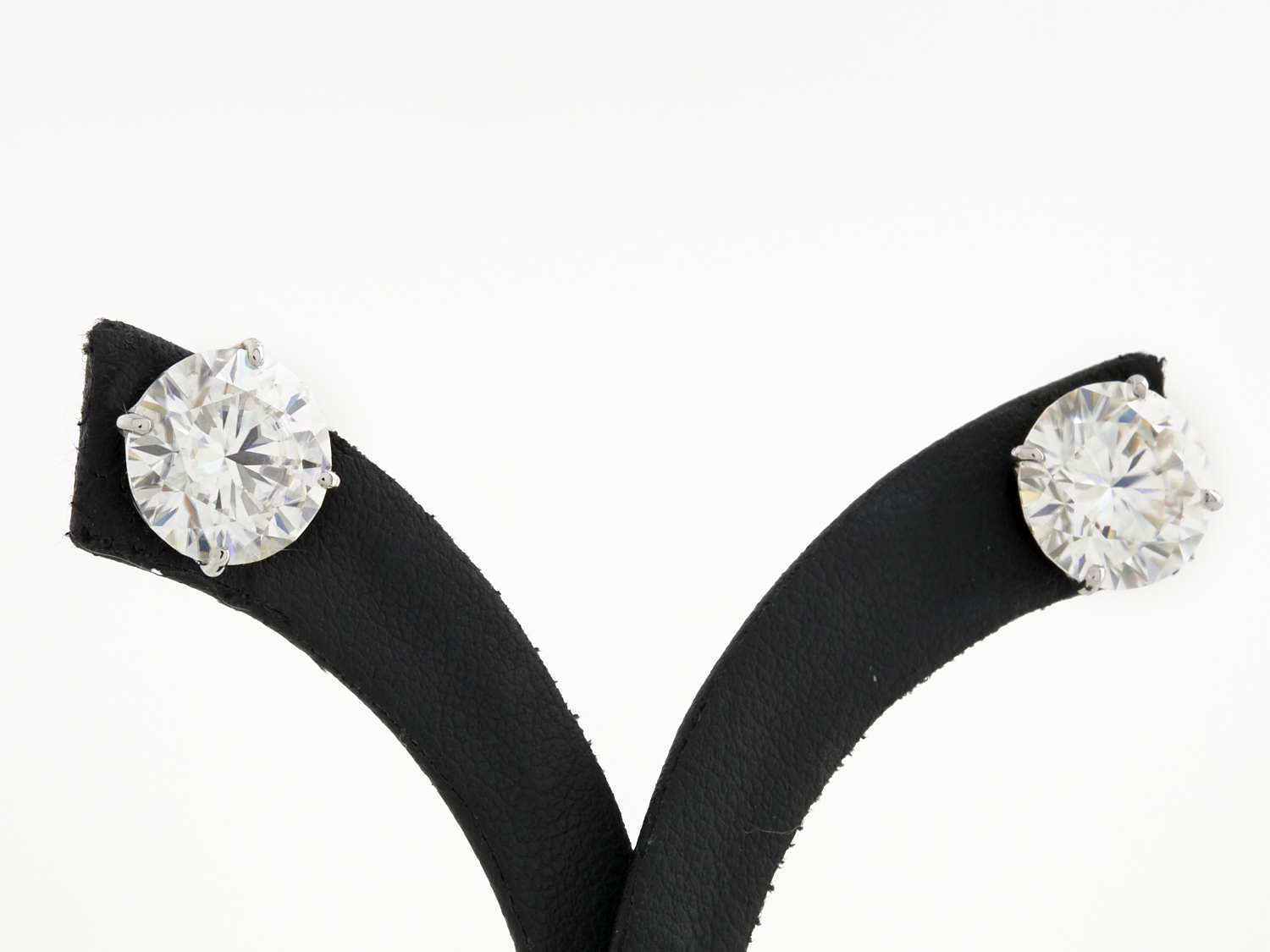 A PAIR OF MOISSANITE EARRINGS IN 18CT WHITE GOLD TO POST AND BUTTERFLY FITTINGS, THE MOISSANITES TOTALLING 9.04CTS, LASER INSCRIBED WITH ID CARD