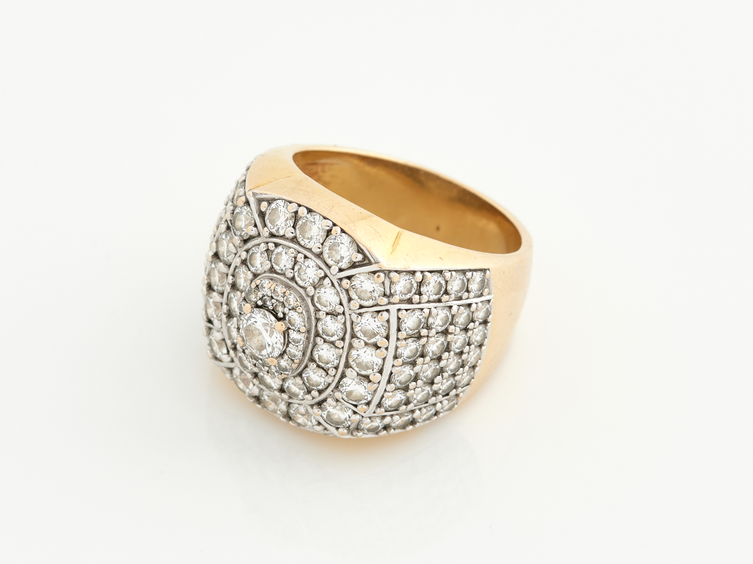 A DIAMOND GENTS RING IN 18CT GOLD, THE DIAMONDS TOTALLING APPOXIMATELY 3.20CTS, SIZE V1/2, 17.5GMS, ACCOMPANIED BY A VALUATION
