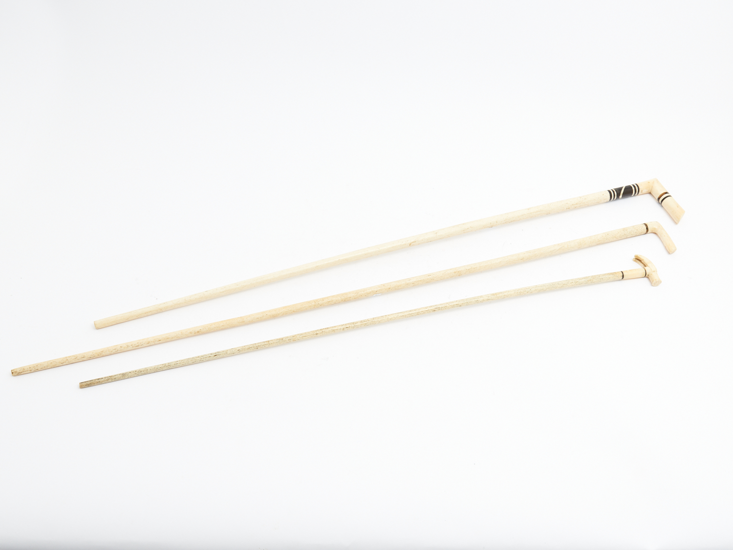 THREE WHALE BONE WALKING STICKS INCLUDING ONE WITH A HAMMER FORM HANDLE (A/F) L.96CM (LONGEST), LEONARD JOEL DELIVERY SIZE: MEDIUM